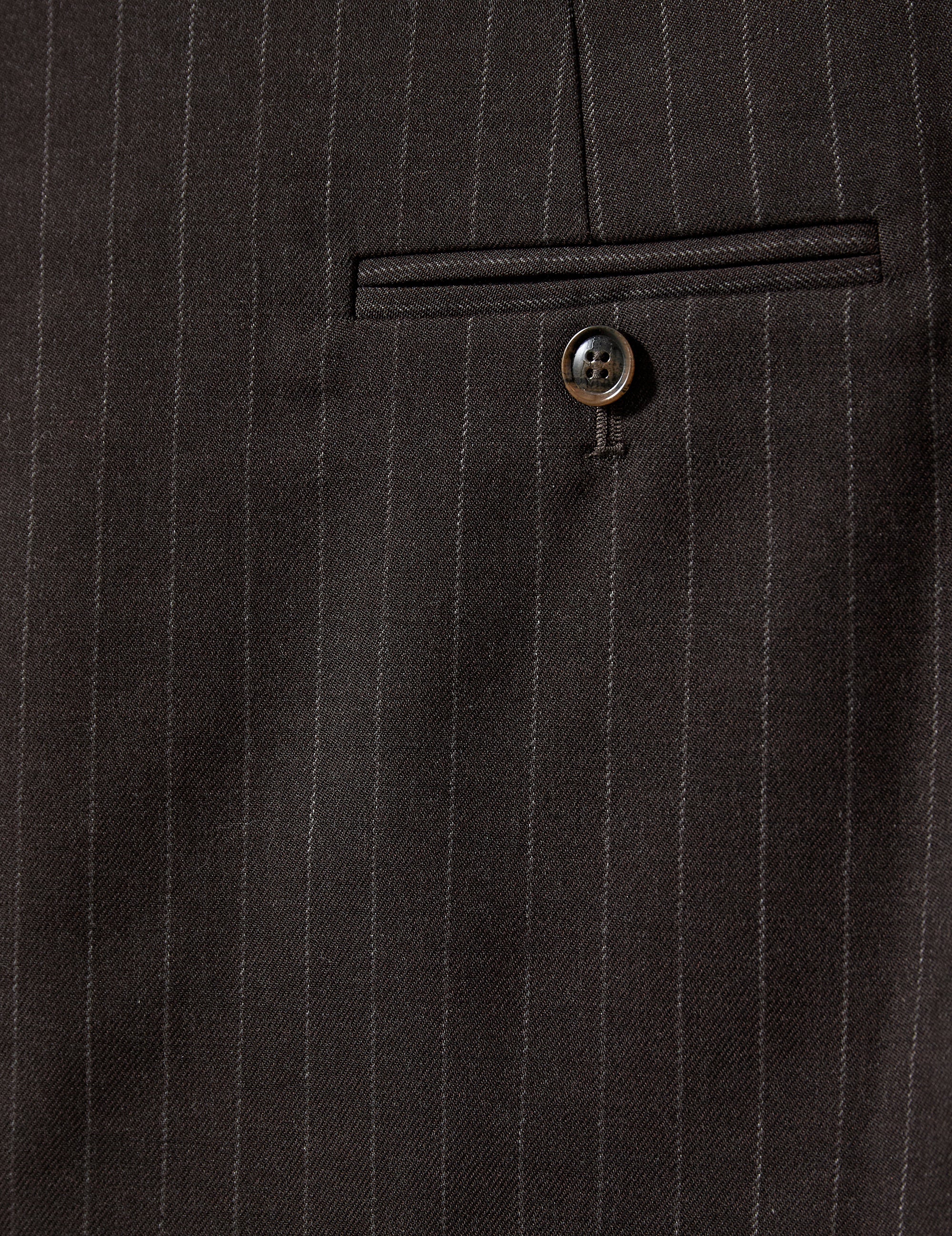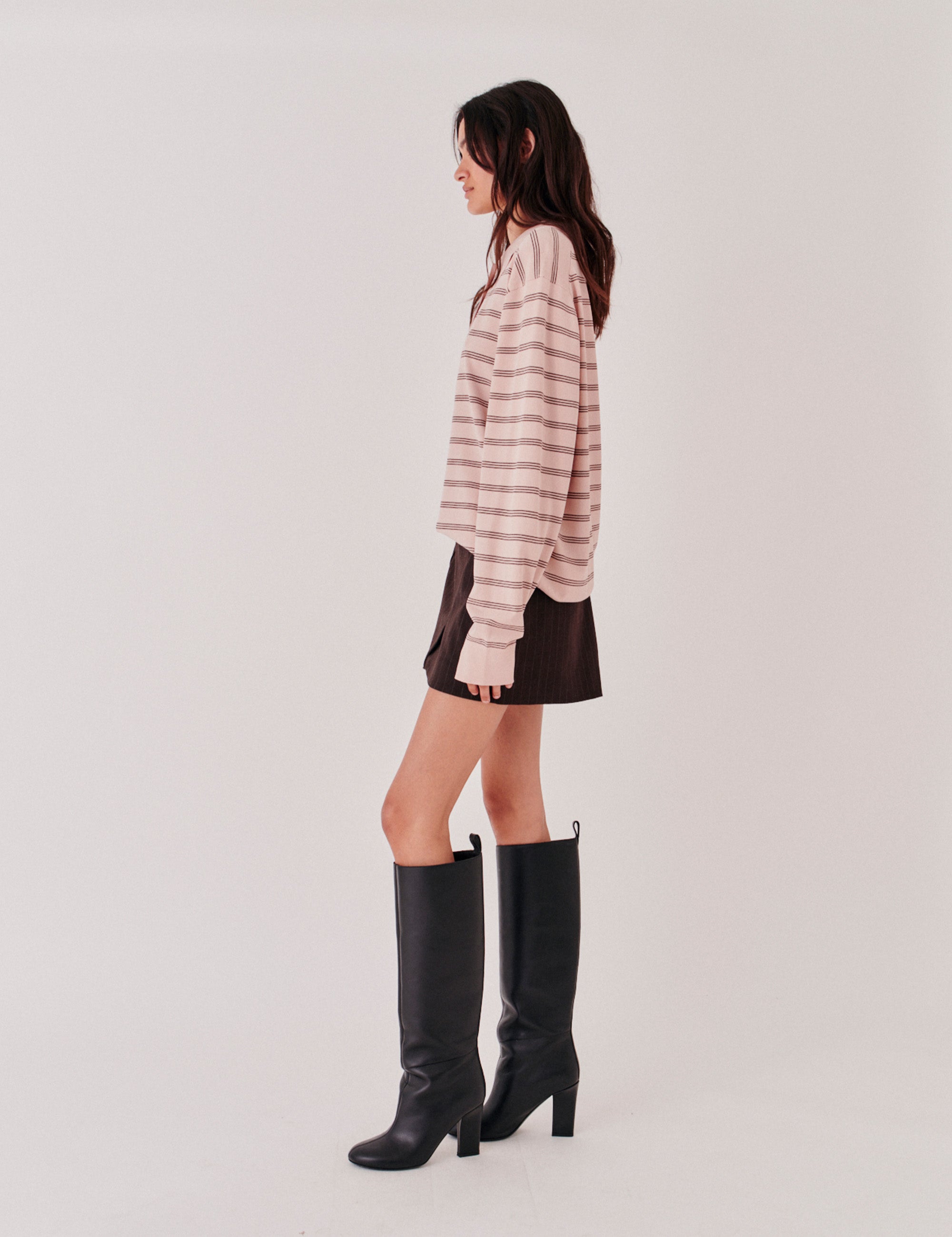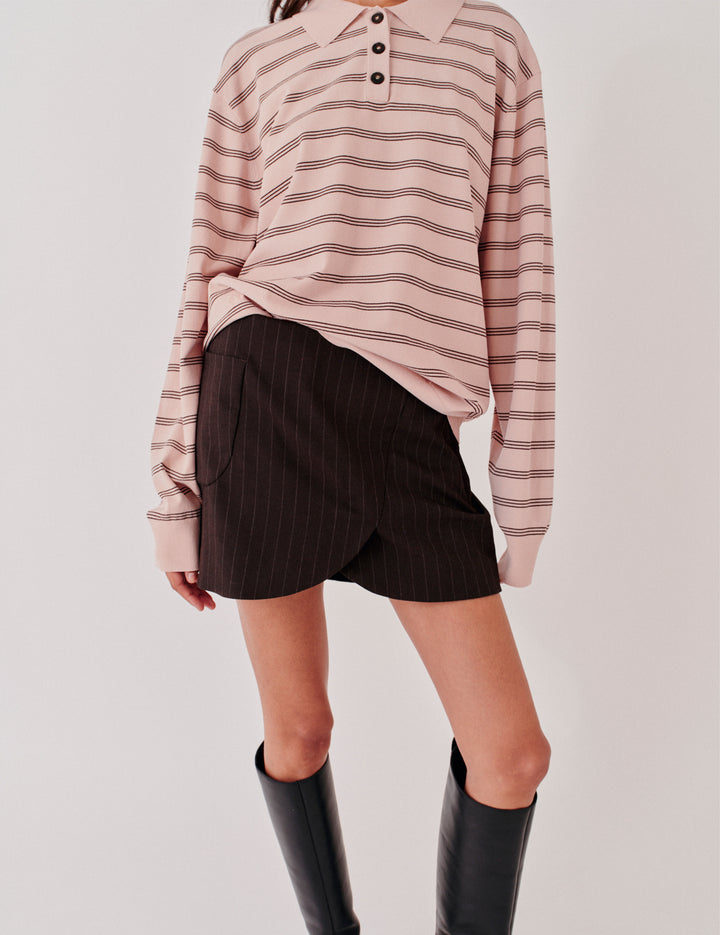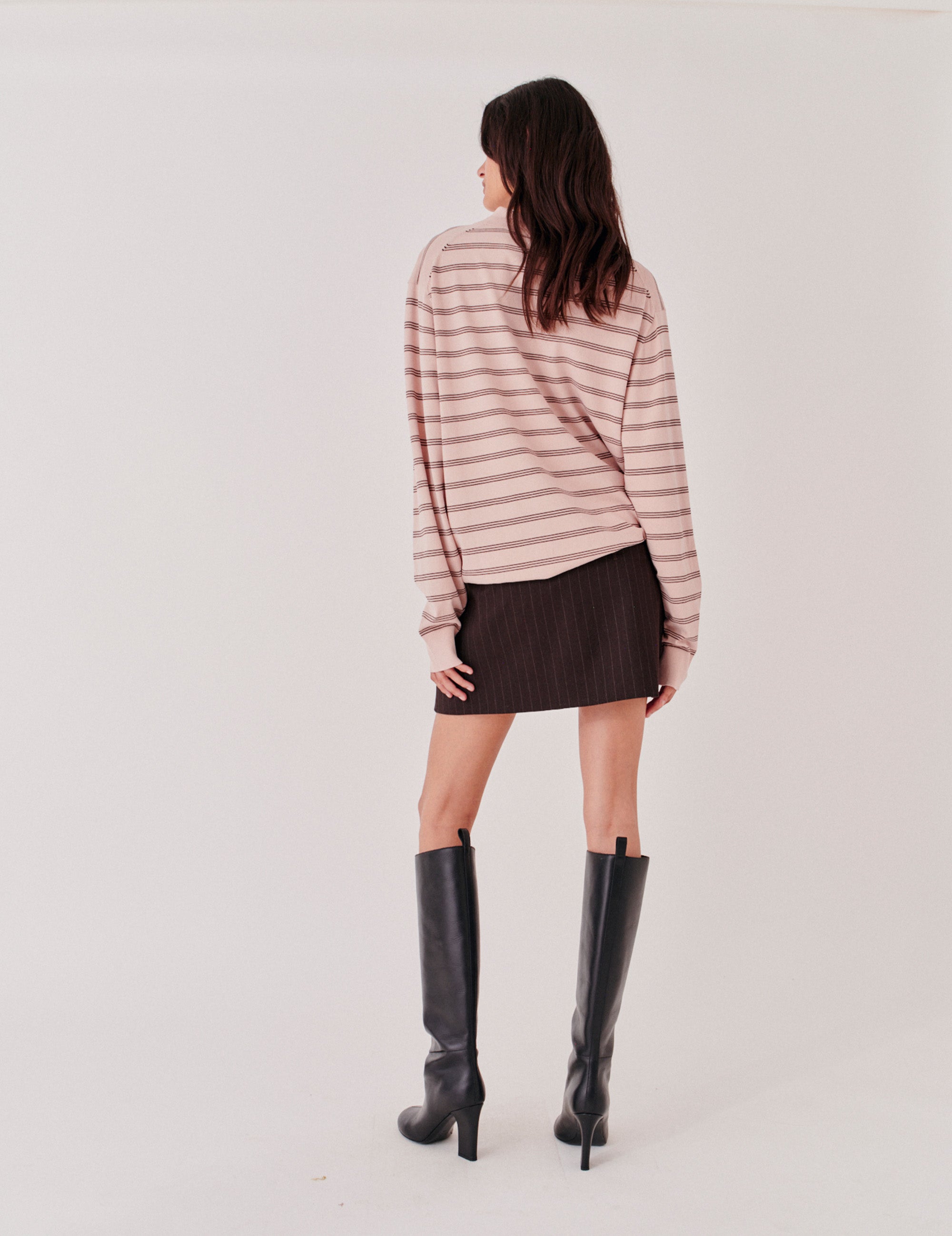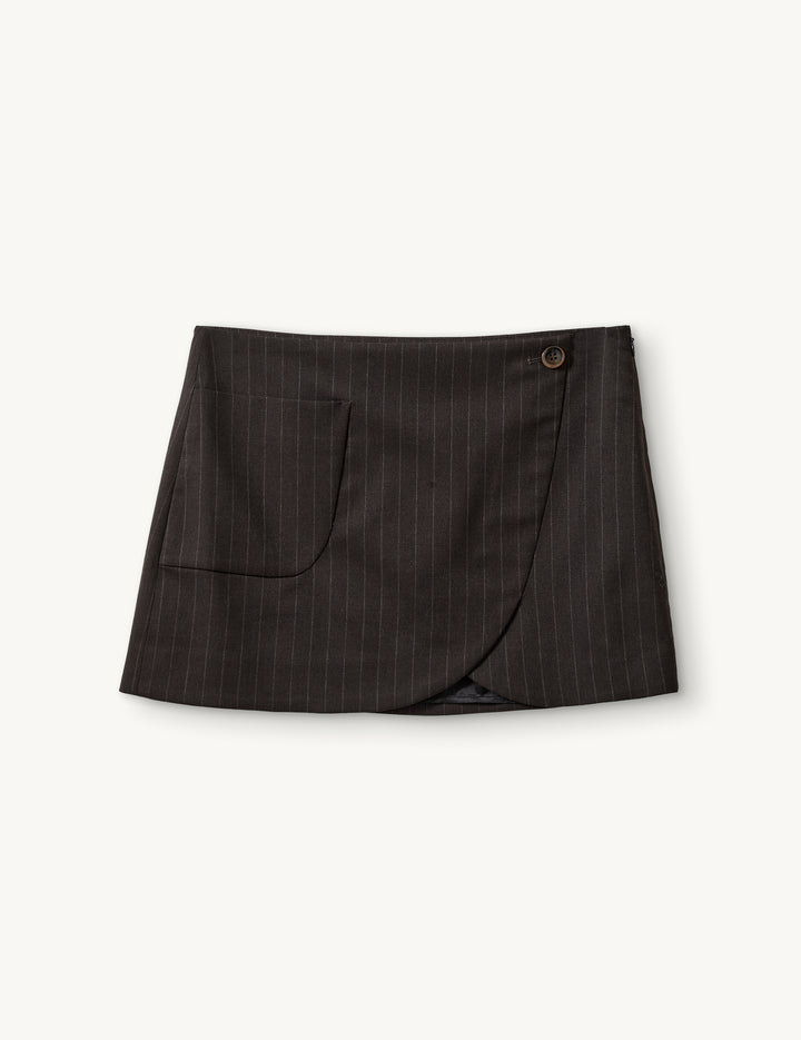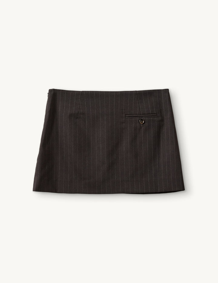 The Andora Mini in dark brown pinstripes is an asymmetric mini skirt that blends modern edge with classic tailoring. Its unique cut adds a stylish twist to a wardrobe staple.