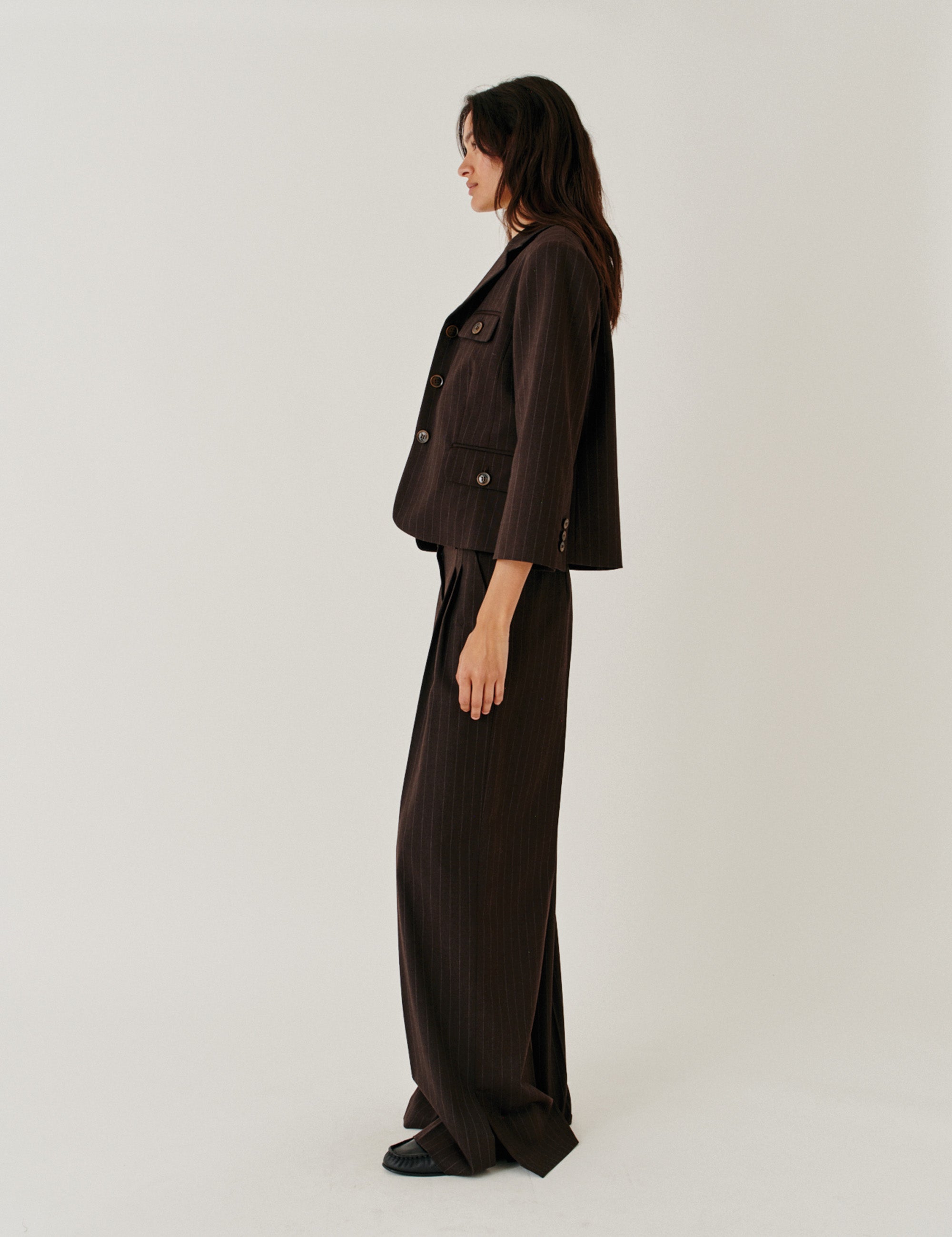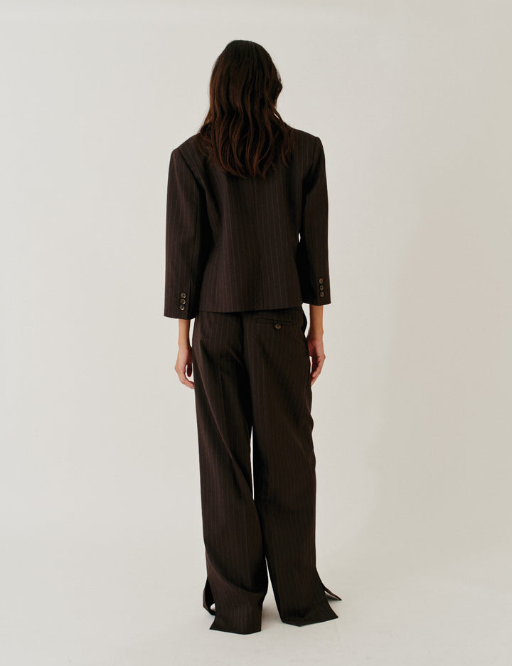 The Andora Pants feature a wide fit with pleated detailing and classic pinstripes for a polished, tailored look. Perfect for adding a touch of sophistication to any outfit.