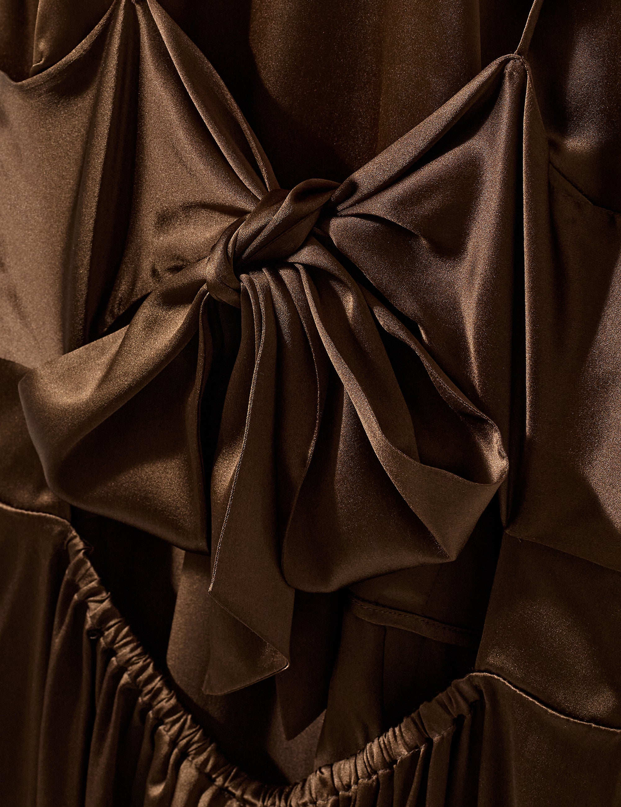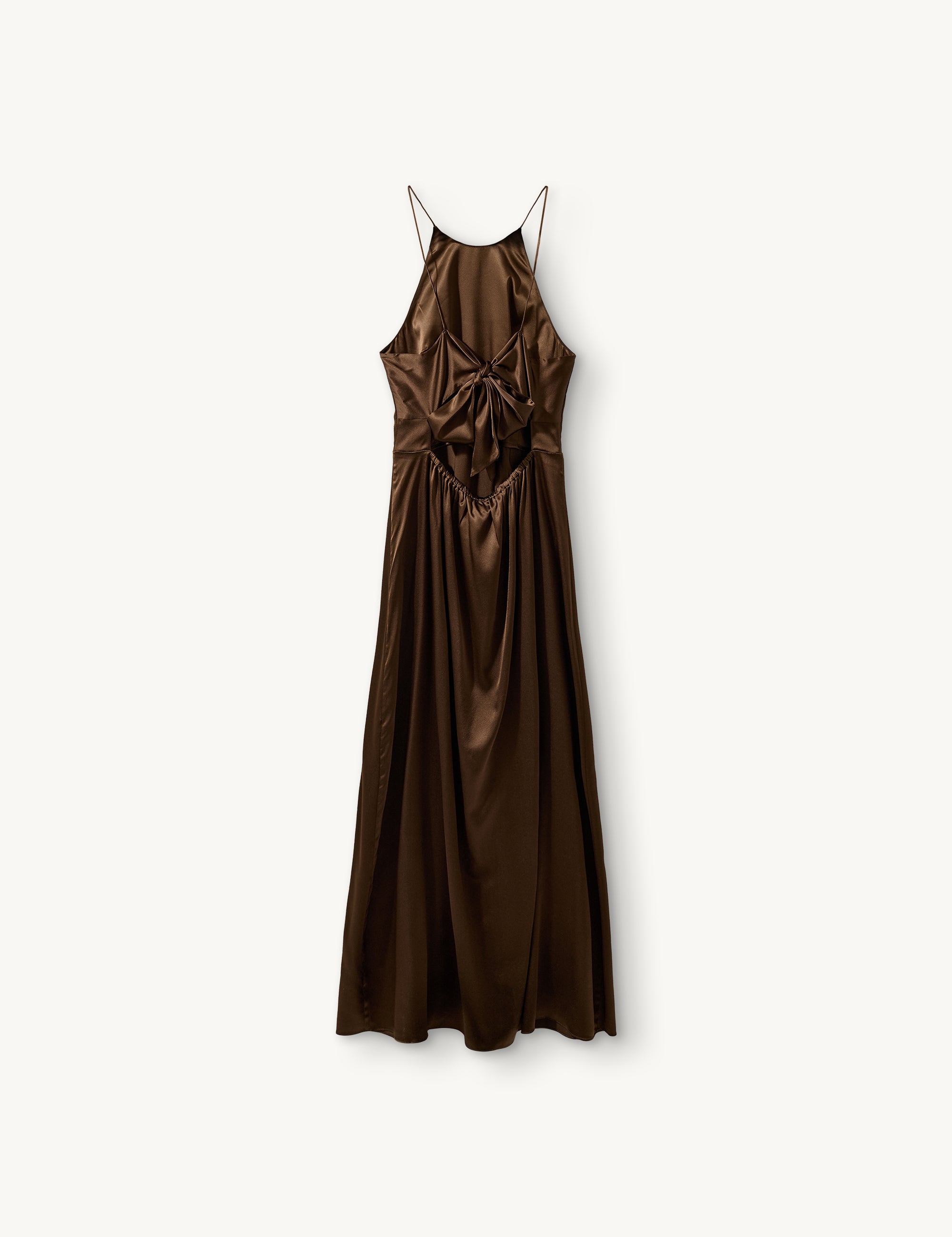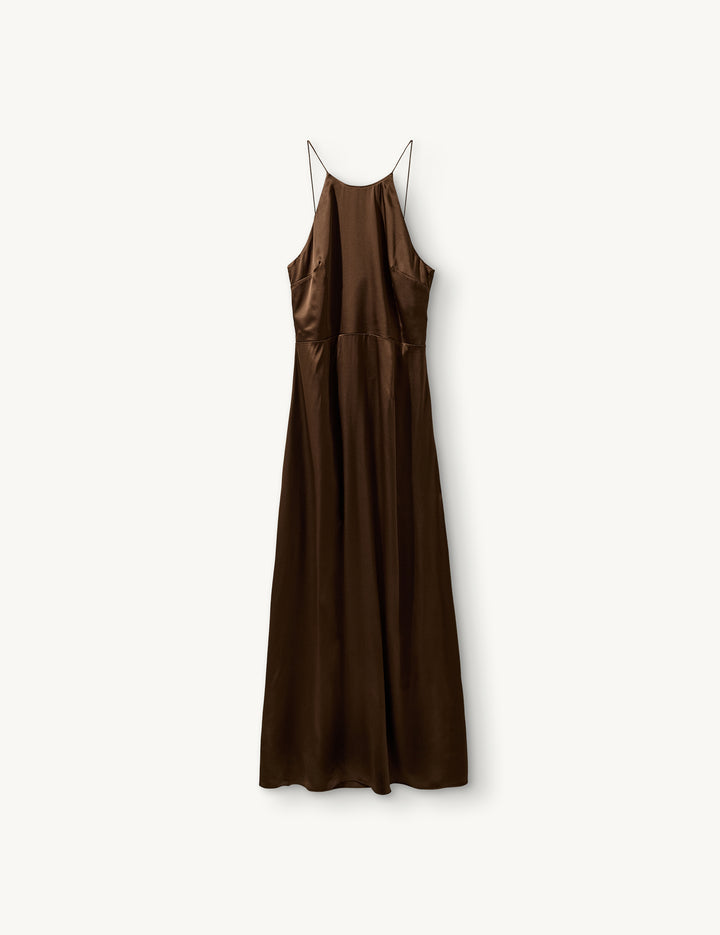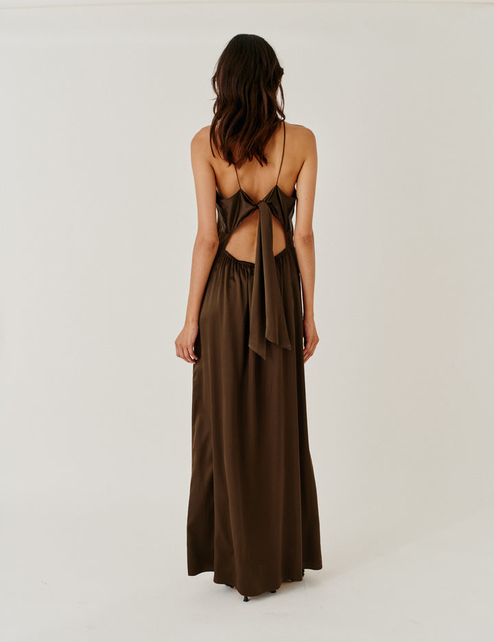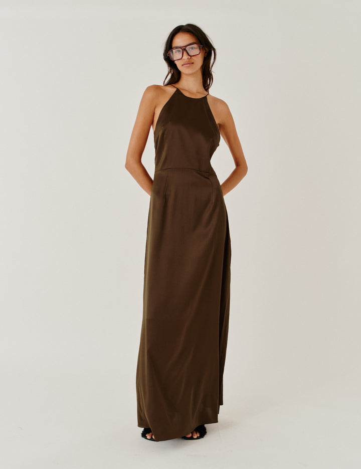 The Cata Gown is a long halterneck dress crafted from luxurious silk, featuring a tie detail at the back for an adjustable and elegant fit. Its flowing silhouette exudes timeless sophistication.