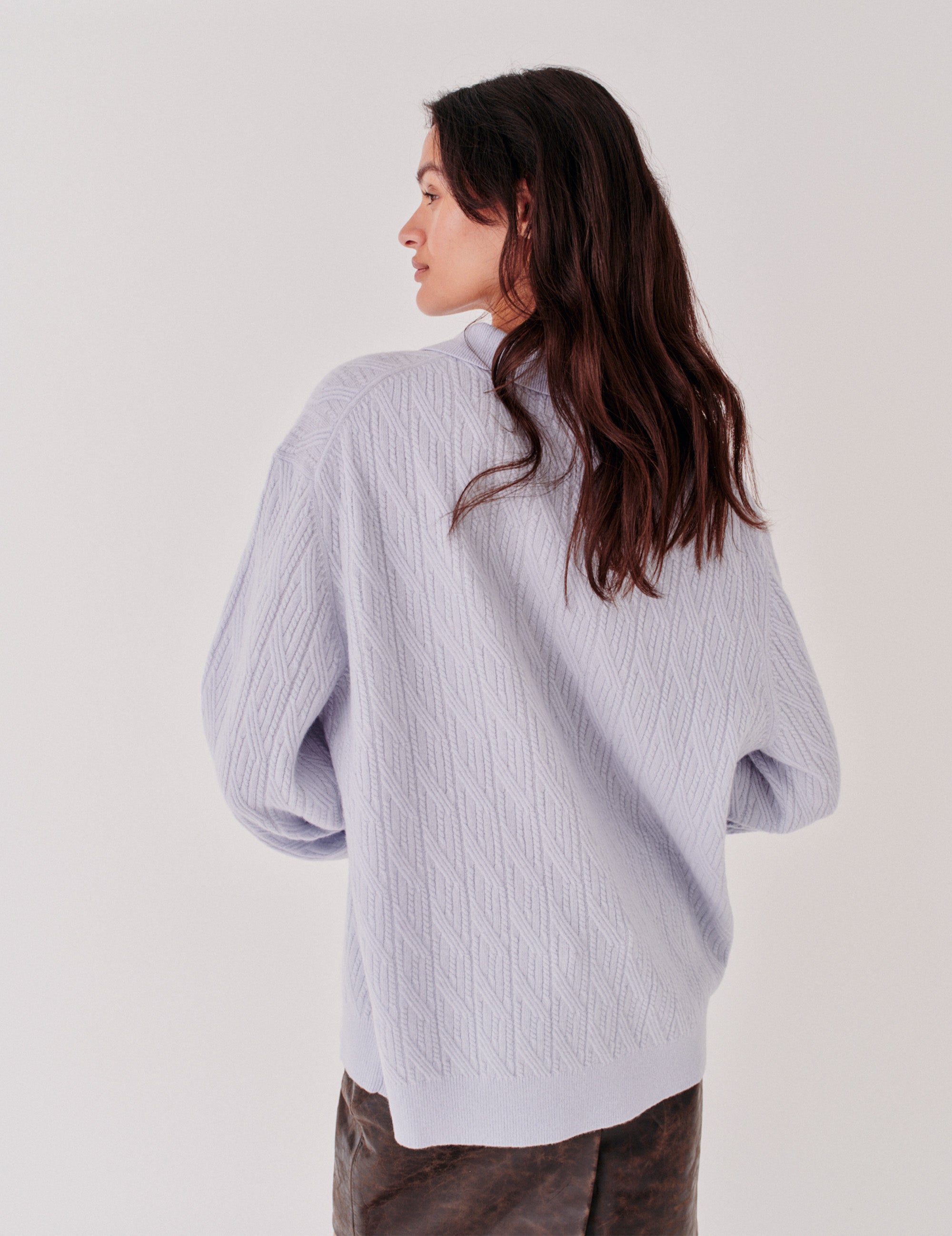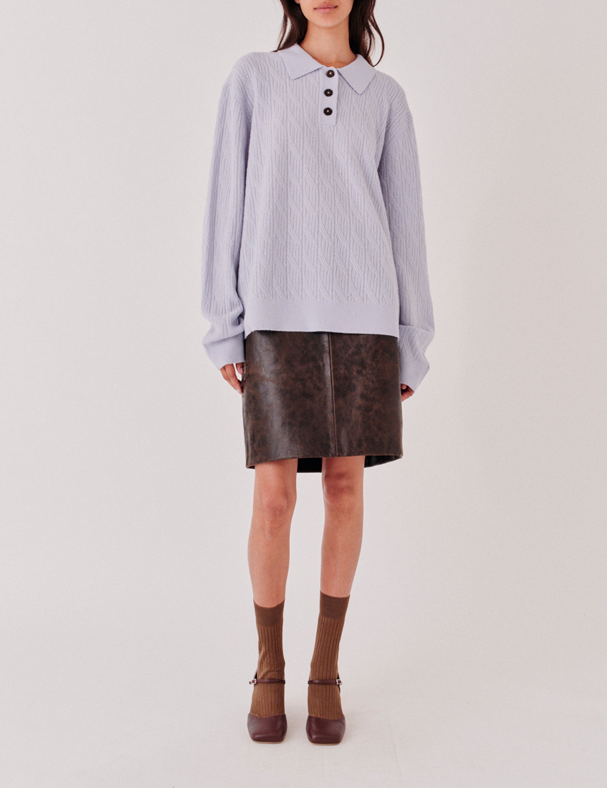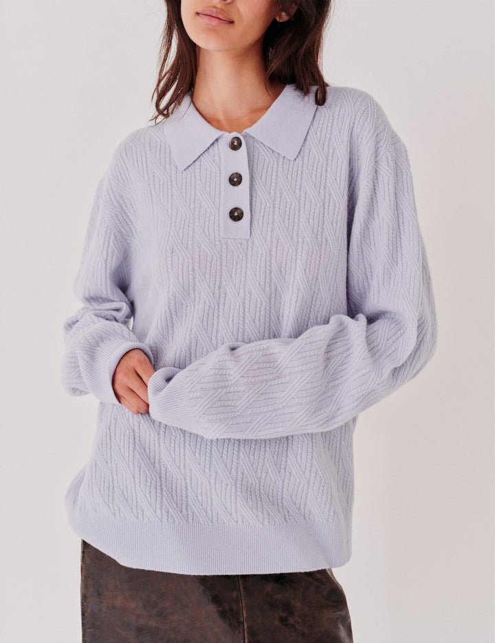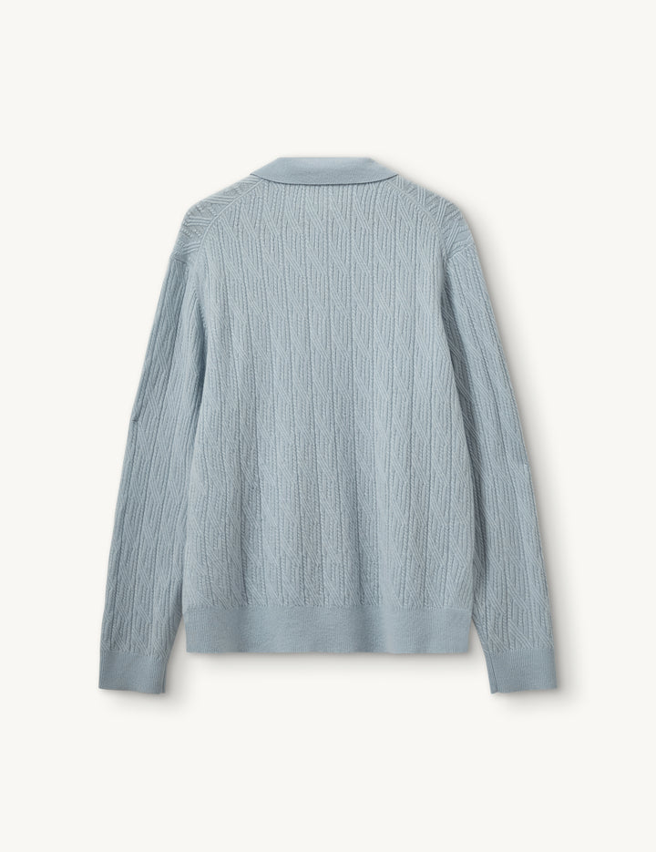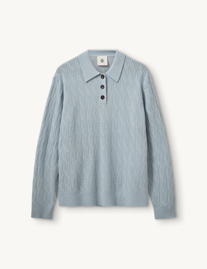 The Como Cable Polo is a soft knit sweater featuring a classic polo collar and cable detailing. Made from a luxurious wool-cashmere blend, it combines timeless style with cozy comfort.