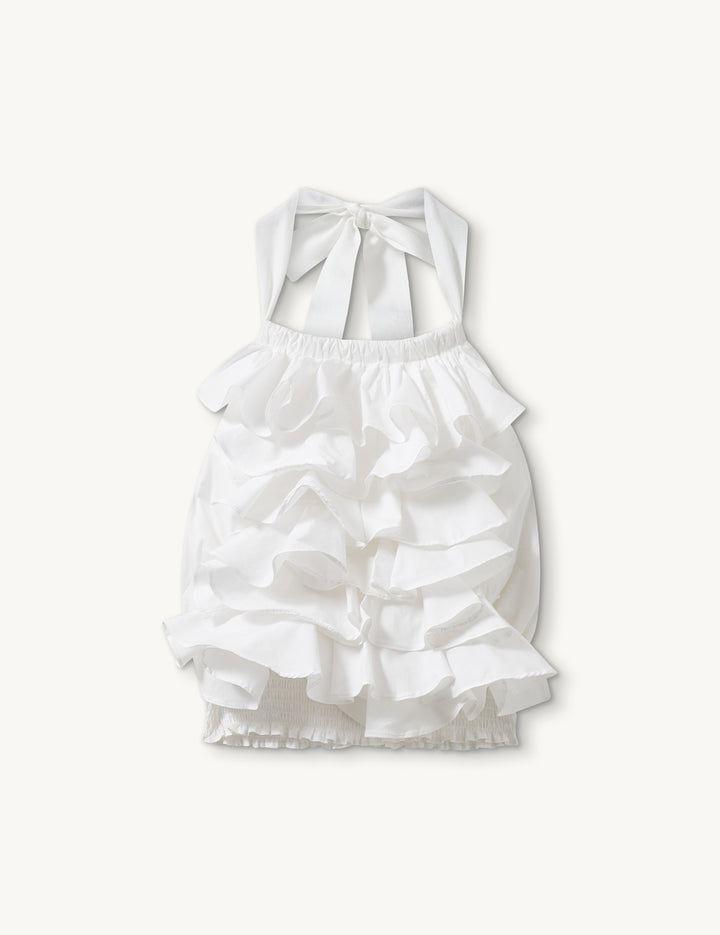 The Cyprus Layer Top features front ruffles and an open back, with adjustable tie strings at the neck and for a customizable fit. Elevate the summer wardrobe with this versatile staple, perfect for any occasion.
