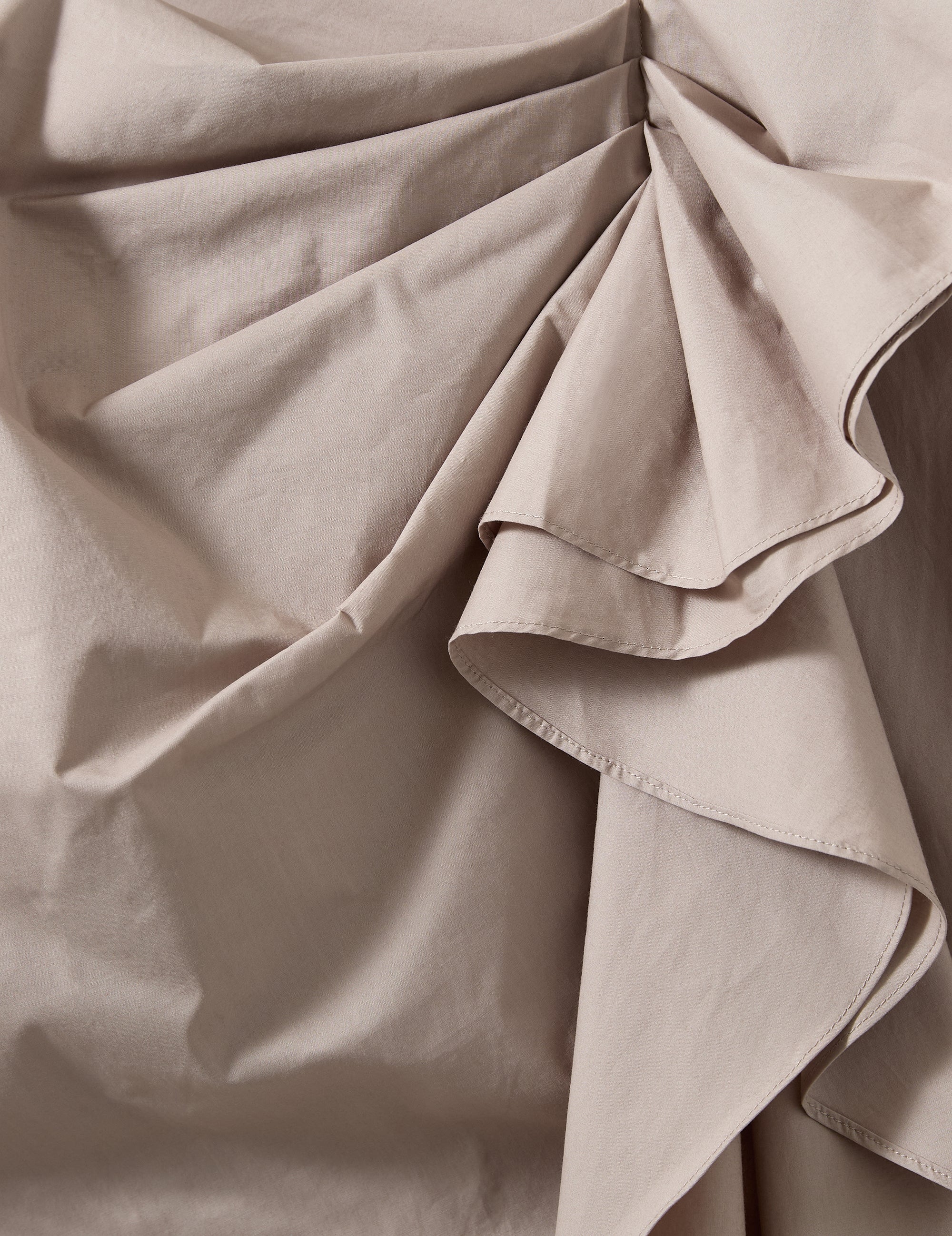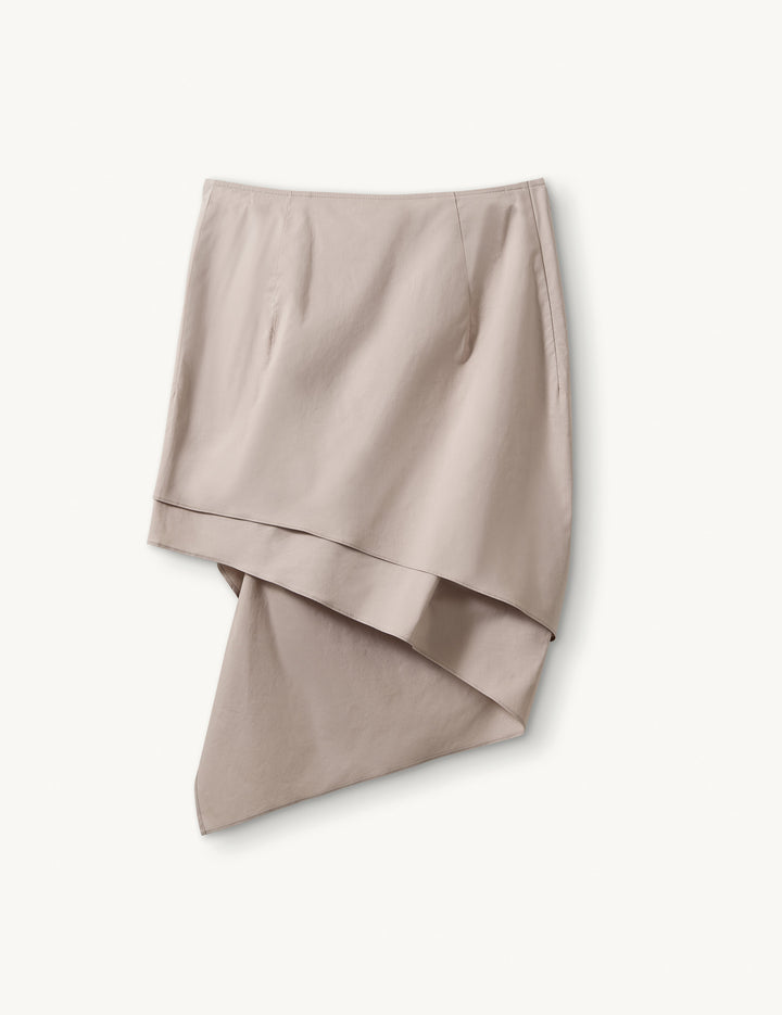 The Cyprus Side Drape Skirt in white features an elegant asymmetrical hemline and soft side draping that creates fluid movement. A modern take on a classic silhouette, perfect for both casual and elevated styling.