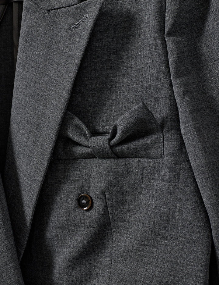 The Grand Blazer is a crafted statement piece, distinguished by a feminine bow detail on the chest pocket.