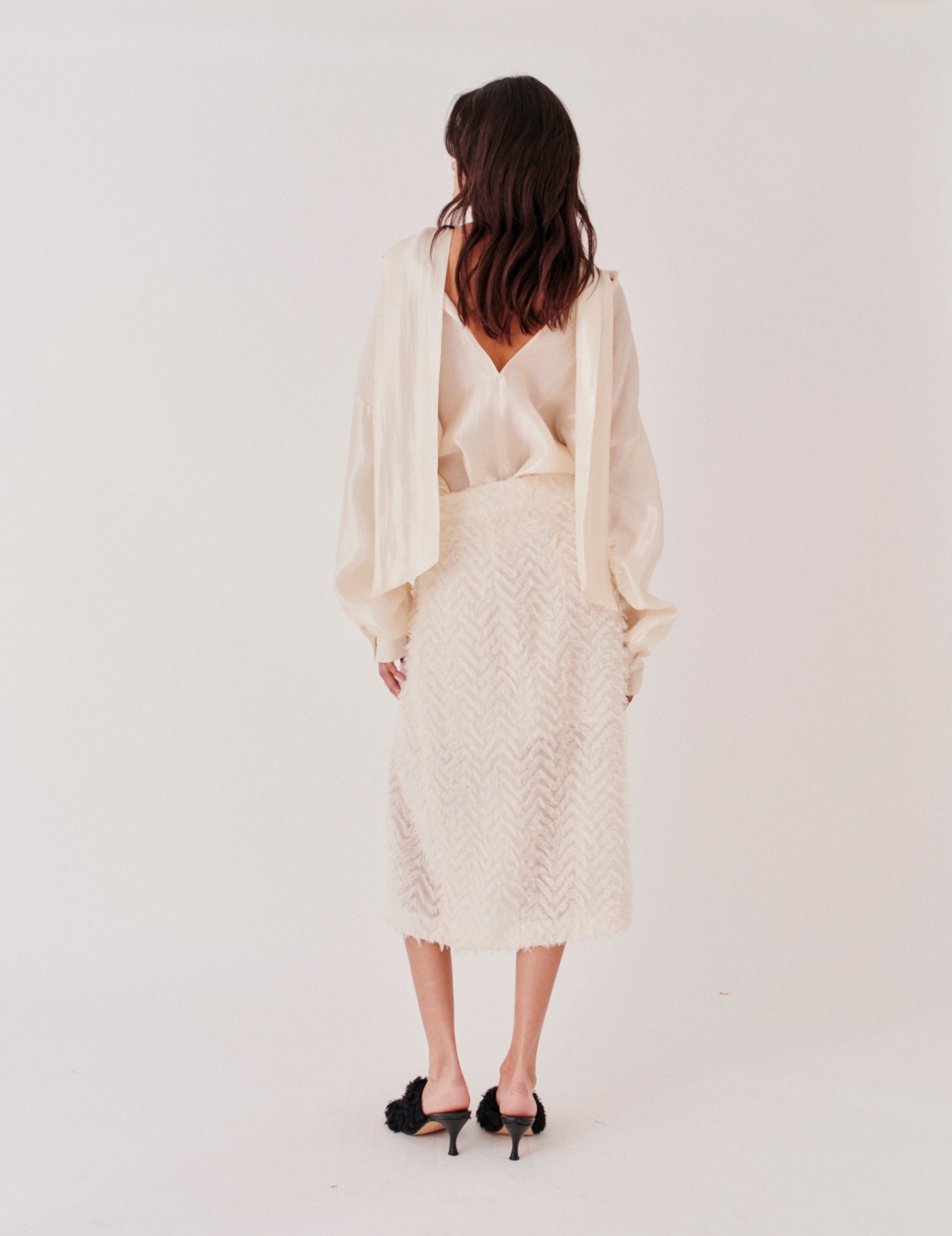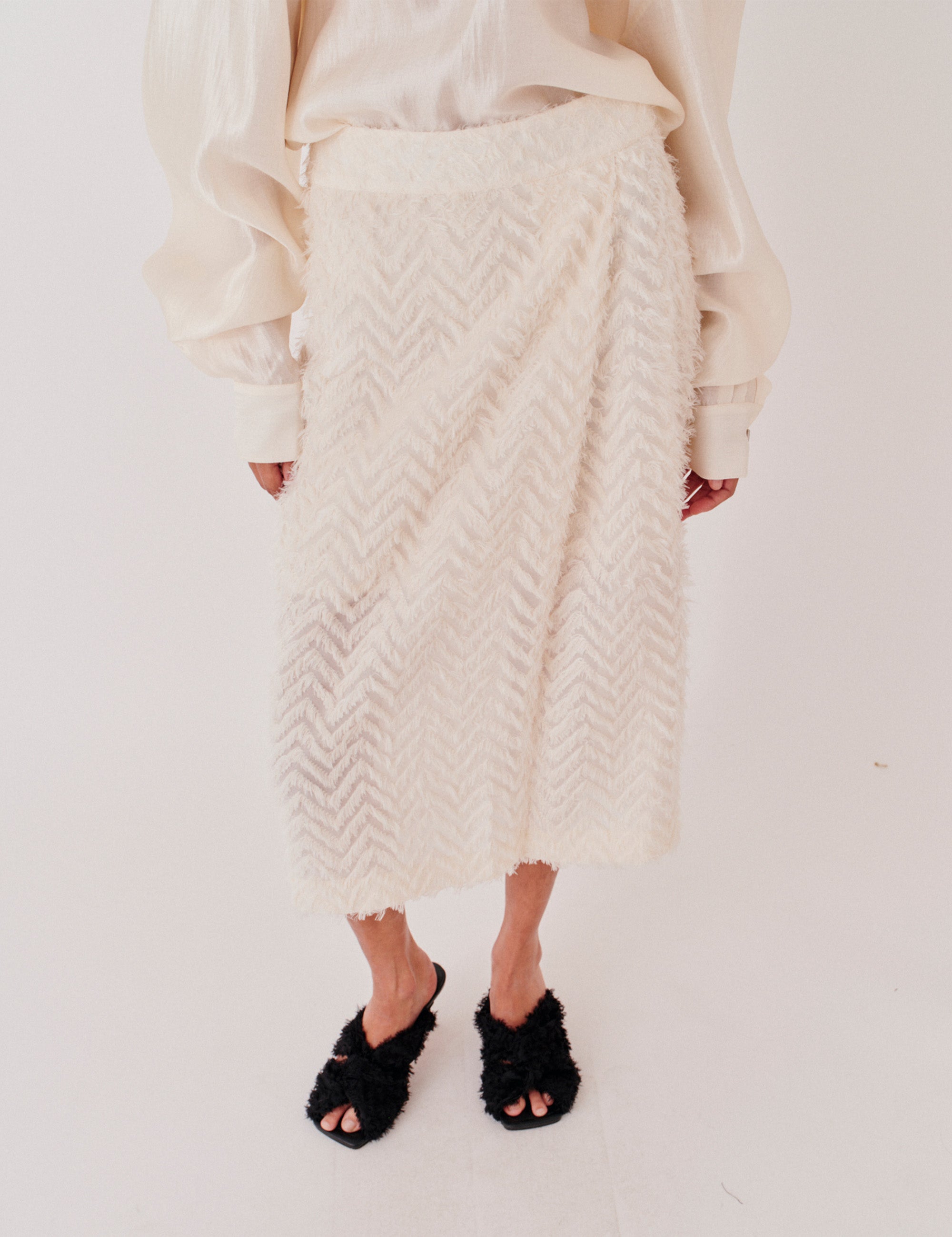 The Lela Skirt is a midi-length design adorned with delicate fringe detailing. Its soft movement and clean lines offer a refined yet playful take on a classic wardrobe staple.