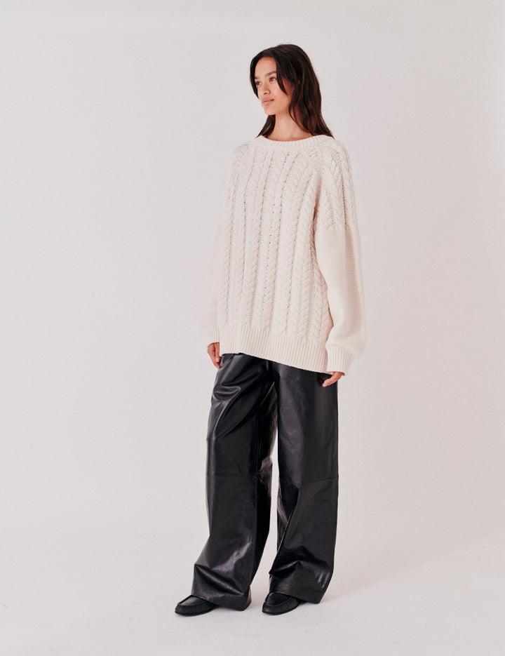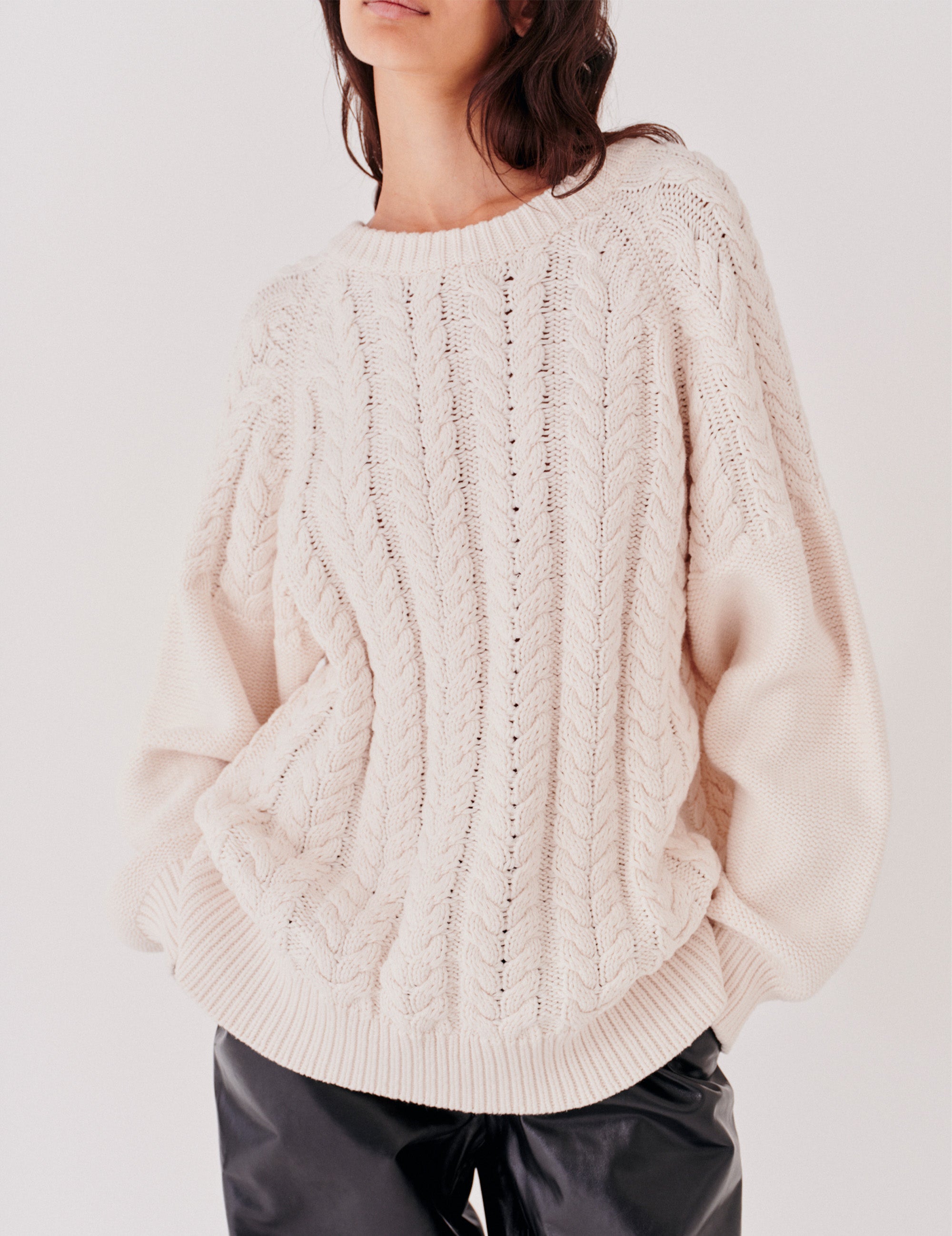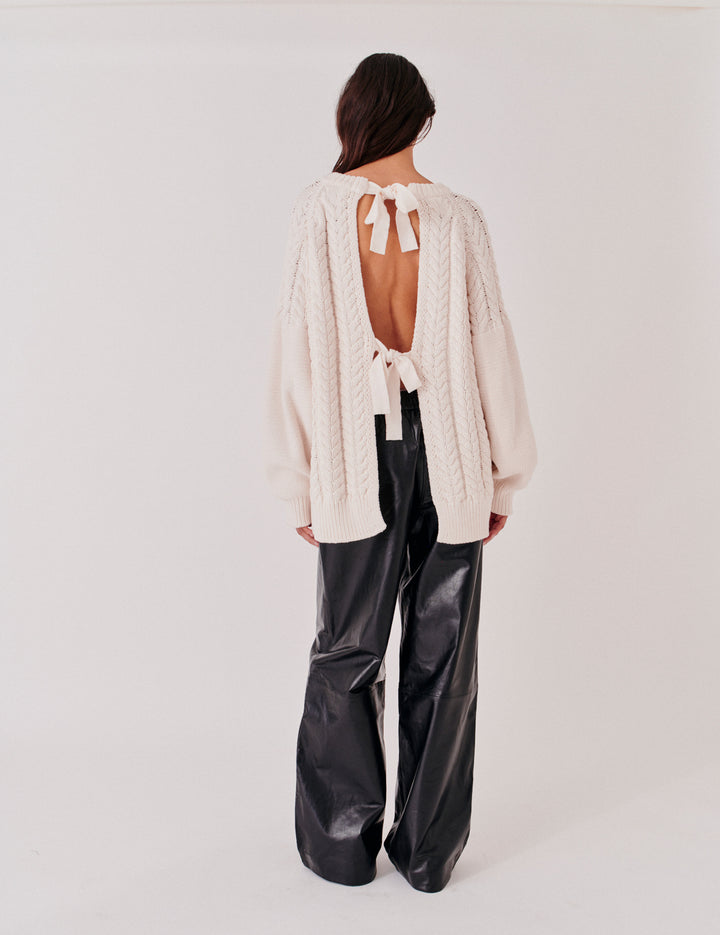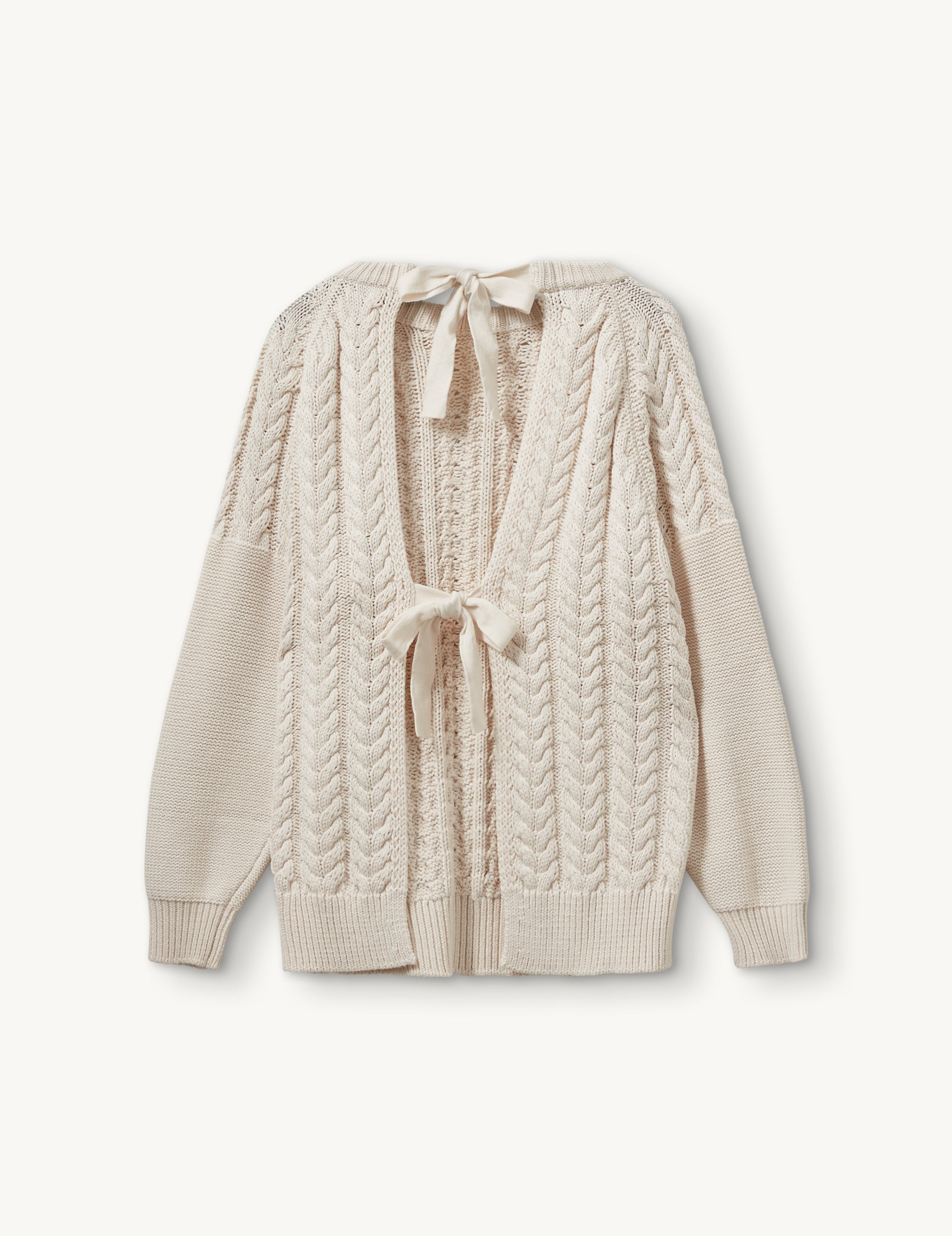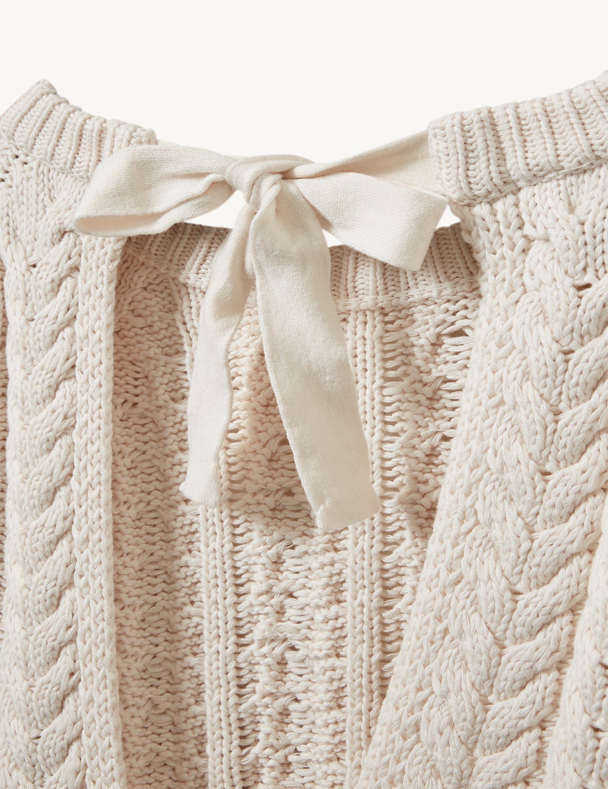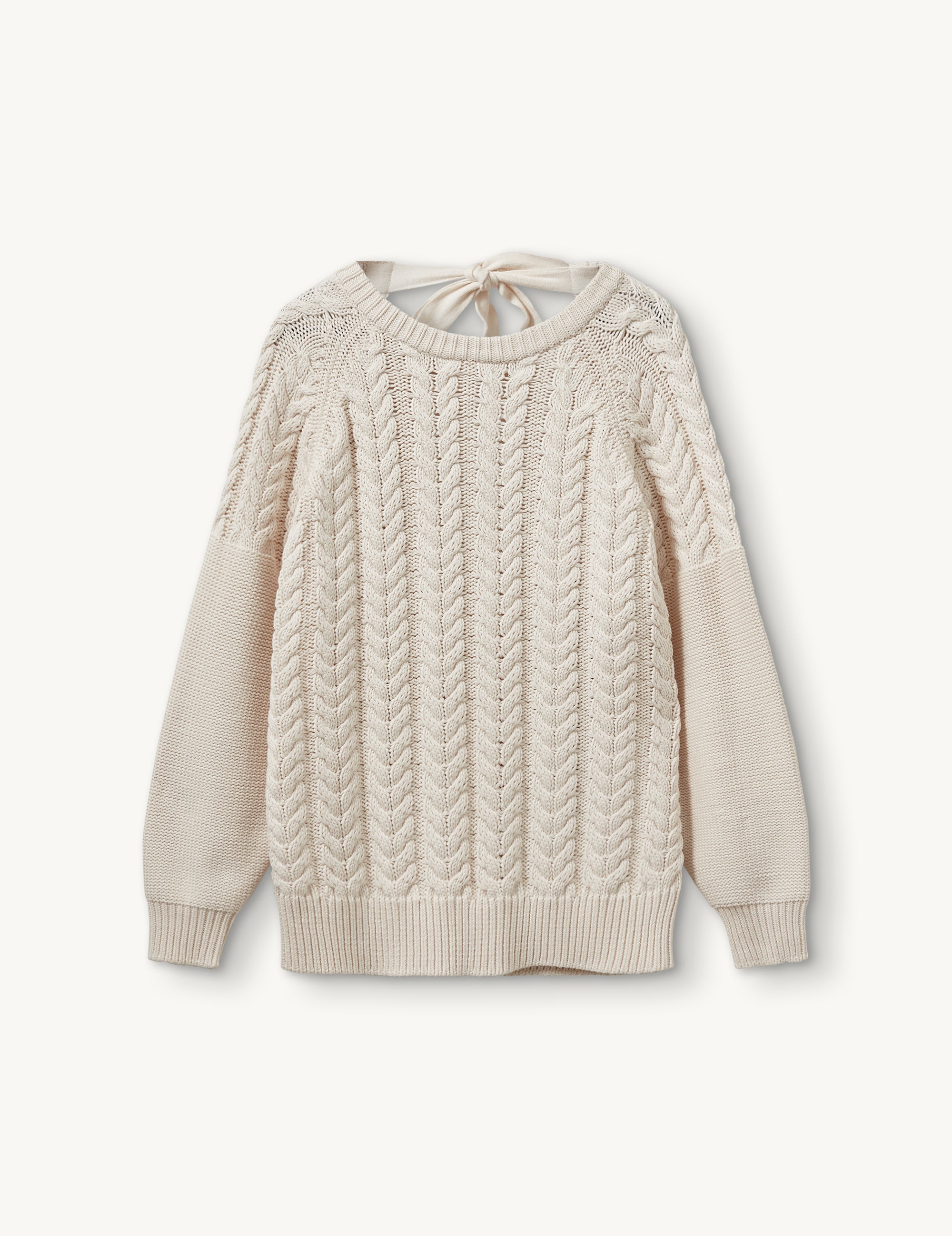 The Leone Bow Sweater is a boxy cable-knit design made from 100% organic cotton. Featuring delicate bow details, it blends cozy comfort with feminine charm.