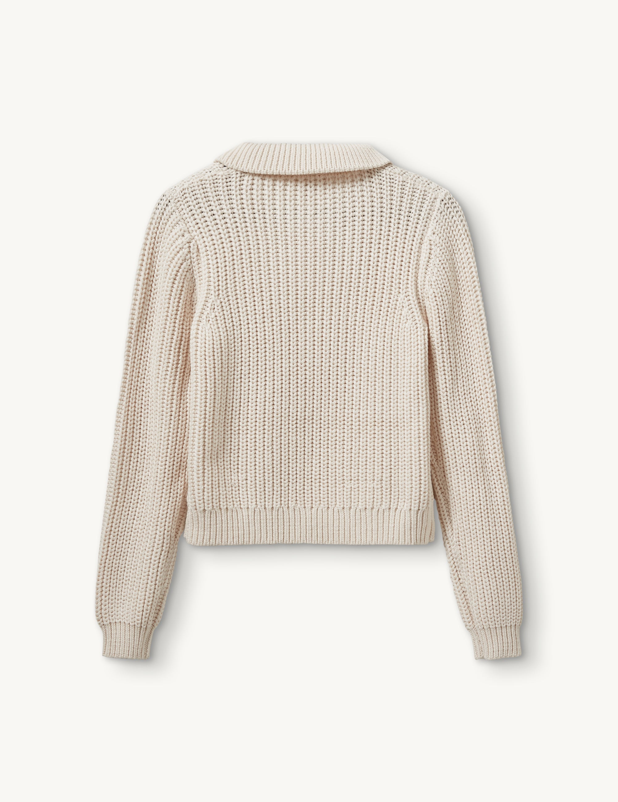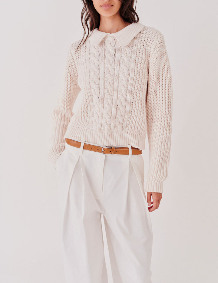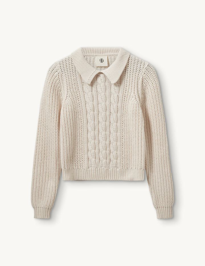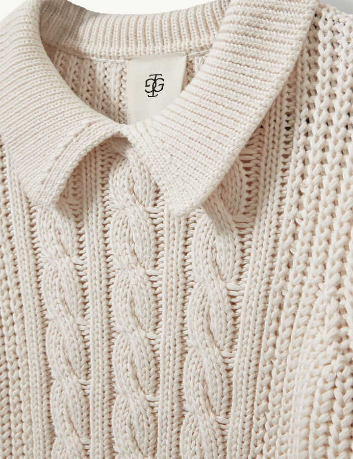 The Leone Mini Polo is a cable-knit sweater with a classic collar, crafted from 100% organic cotton. It offers a cozy, timeless look with subtle texture.