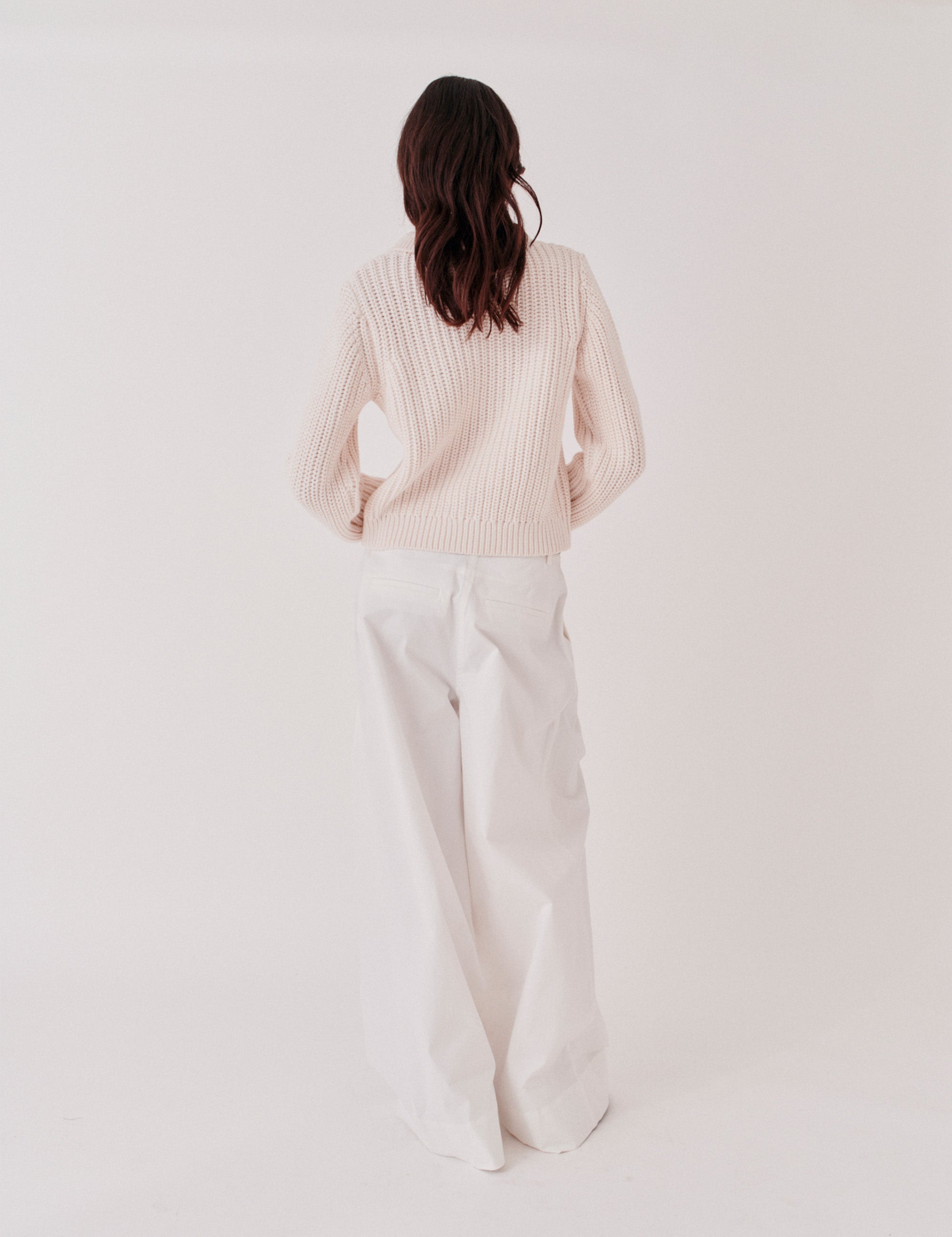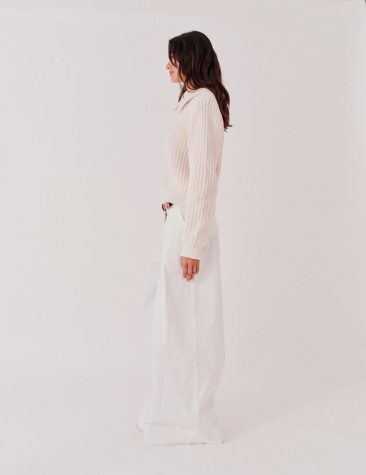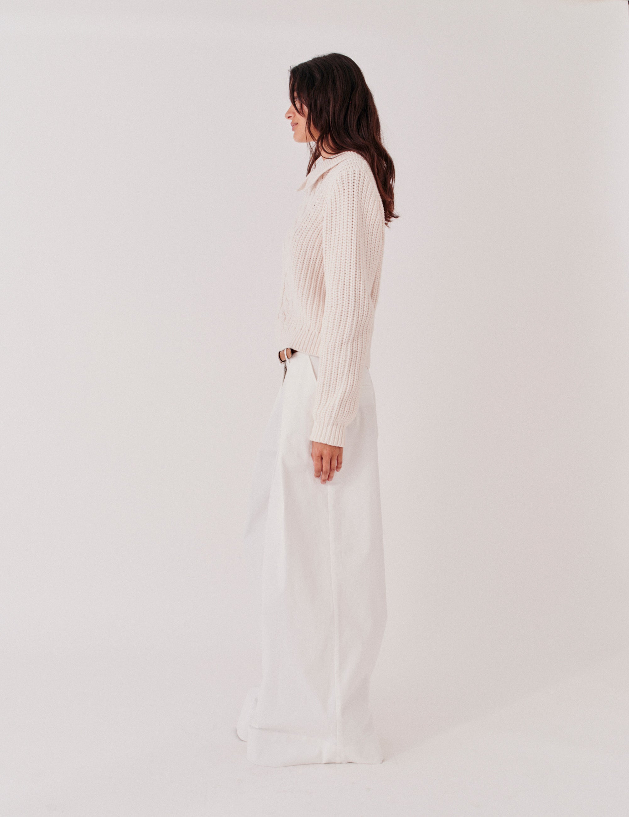 The Leone Mini Polo is a cable-knit sweater with a classic collar, crafted from 100% organic cotton. It offers a cozy, timeless look with subtle texture.
