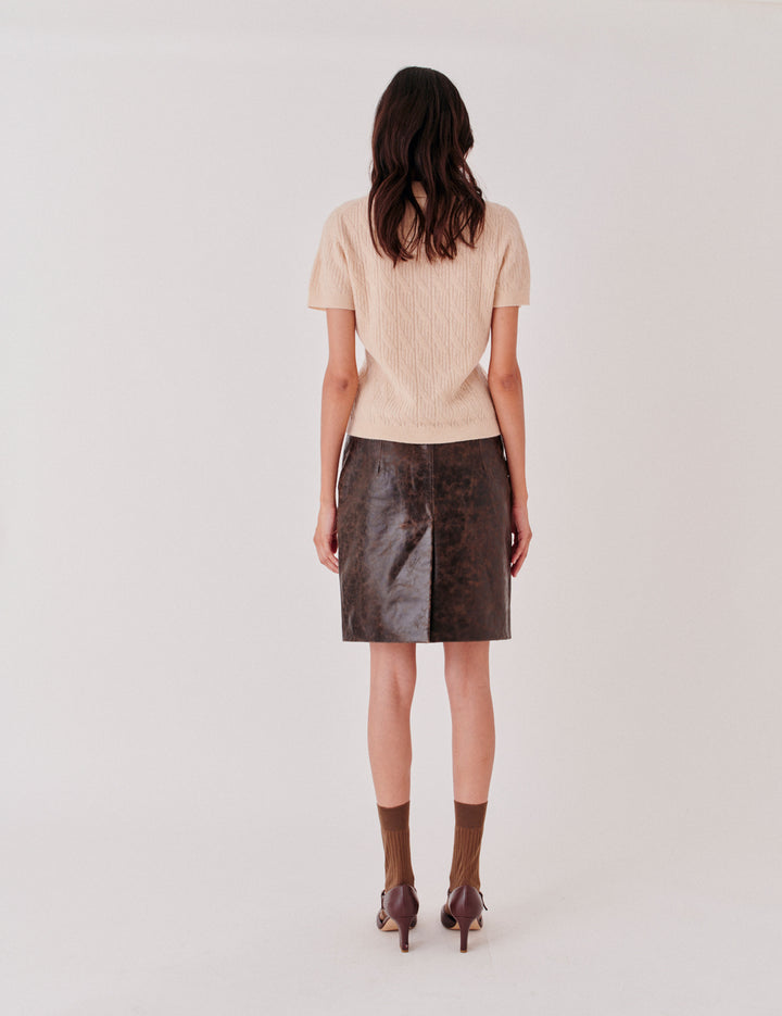 The Margo Skirt is a straight silhouette crafted from lambskin leather with a distinctive crunched texture. It offers a bold, stylish statement with a sleek finish.