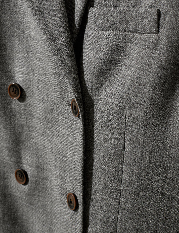 The Pine Blazer is a double-breasted design crafted from 100% virgin wool. Tailored for a structured fit, it offers a timeless, polished look with refined detailing.