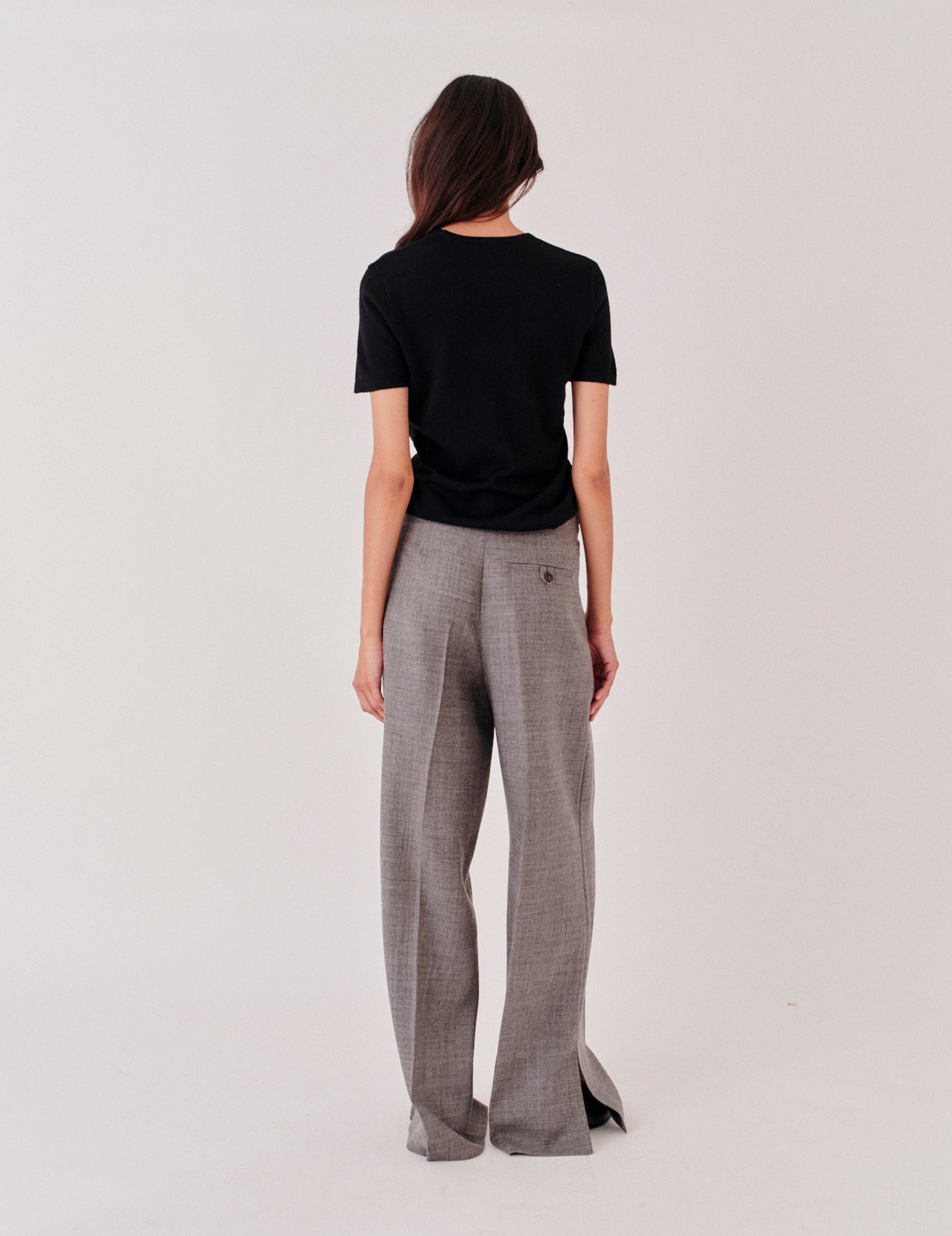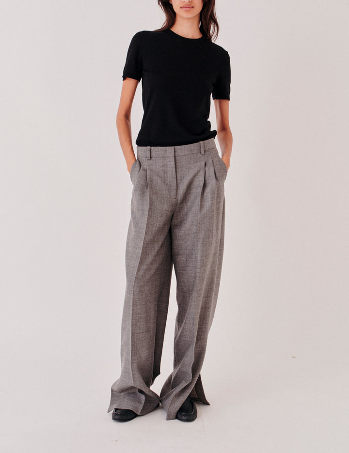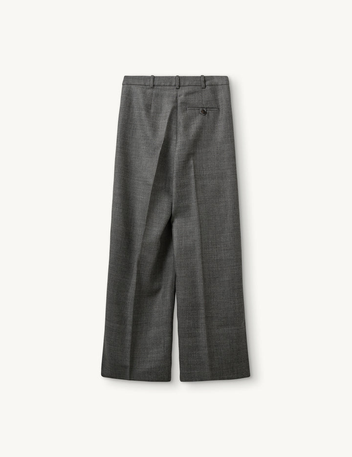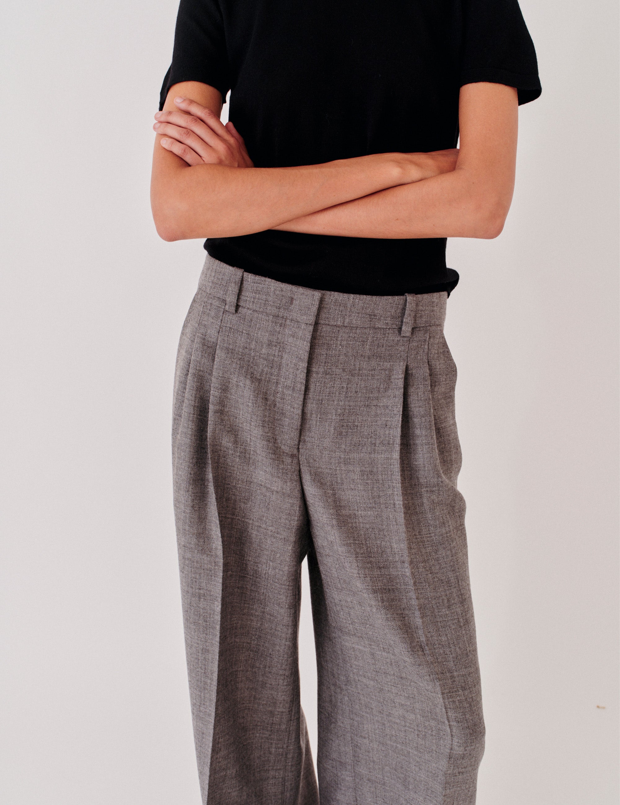 The Pine Pants feature a wide fit with pleated detailing, crafted from 100% virgin wool. These suiting pants blend comfort and elegance for a polished, contemporary style.
