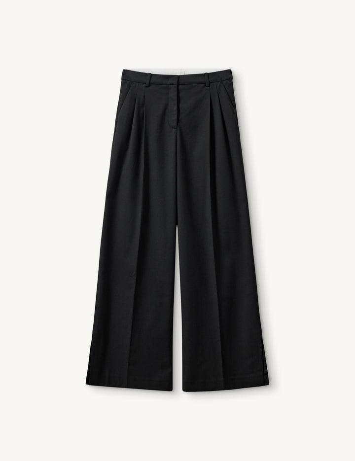 The Pluto Grand Pants are high-waisted tailored trousers with a wide leg fit and subtle side slits at the hem.