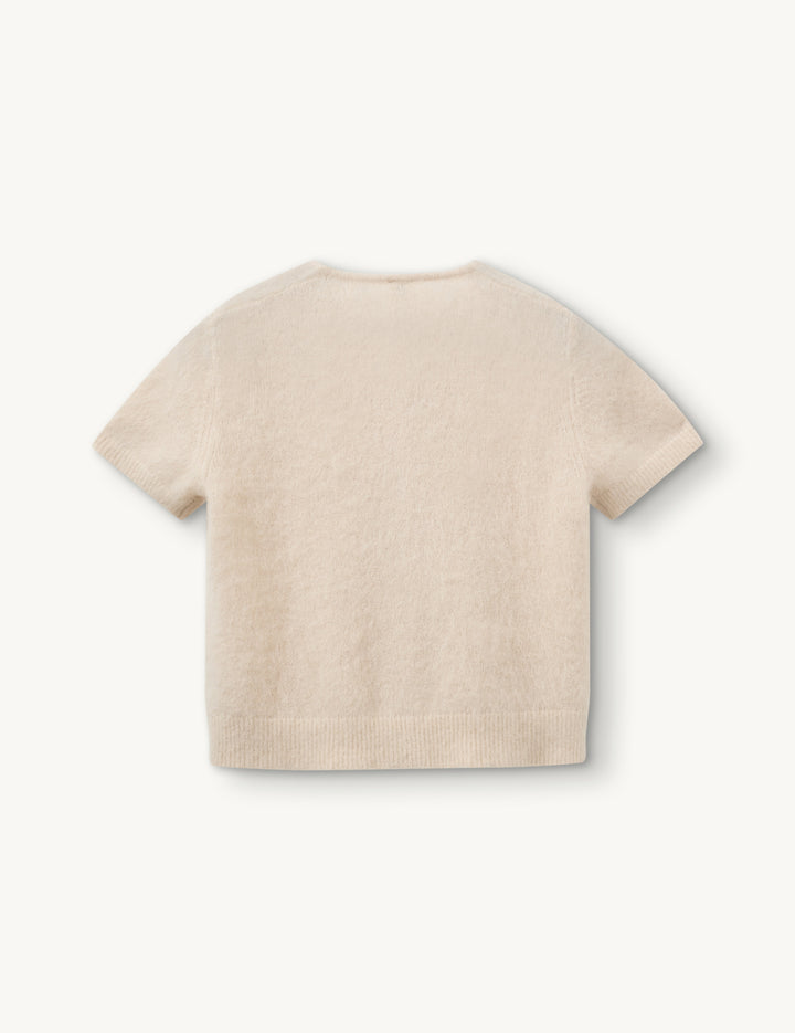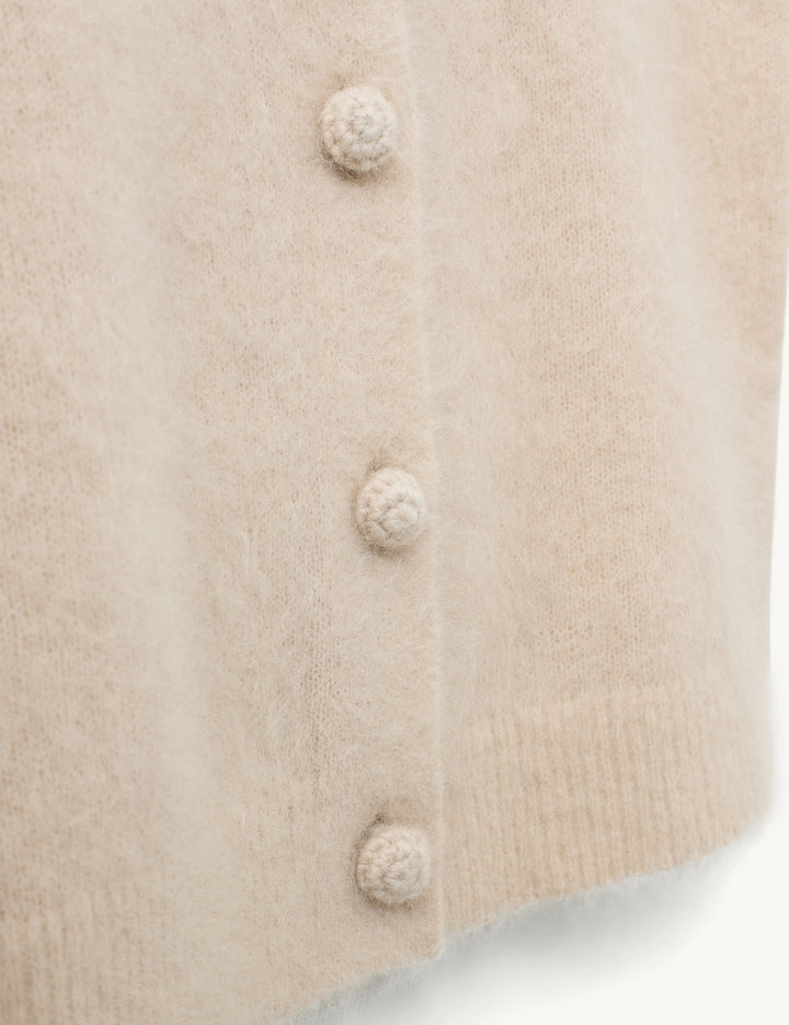 THE ROMA MINI CARDIGAN IS CRAFTED WITH 72% MOHAIR, OFFERING A SOFT, SWEATER-LIKE FEEL. THE TOP FEATURES LARGE, FUNCTIONAL, KNITTED BUTTONS DOWN THE FRONT AND PAIRS EFFORTLESSLY WITH THE ROMA MINI SKIRT FOR A TIMELESS SET.